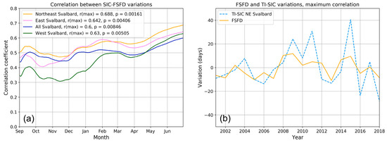 (a) Correlation between TI-SIC and FSFD variations averaged over Nordaustlandet, calculated for SIC integrated from 1 September of the previous year to each consecutive day of year until 30 June of the following year, for the four sea ice regions. The maximum correlation coefficients for each sea region and the associated p-values are stated in the legend. (b) Time series of the TI-SIC variations for the sea region northeast of Svalbard that produced maximum correlation with the time series of FSFD variations over Nordaustlandet.