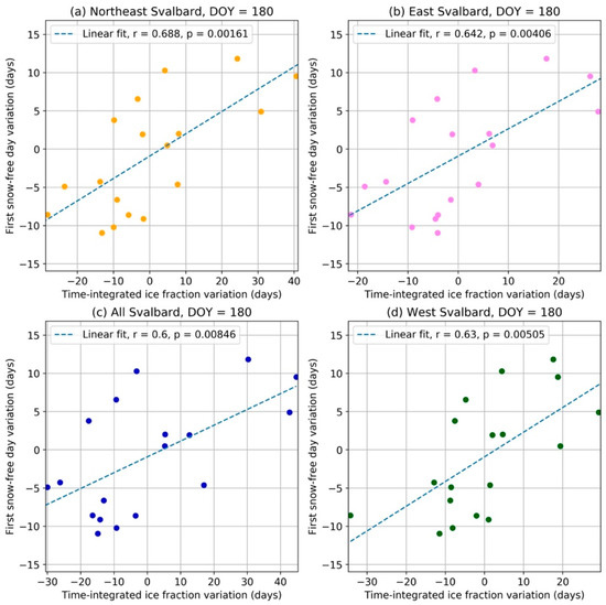 Figure 14a shows the time series of the correlation coefficients that were obtained when correlating the detrended time series of TI-SIC for the four sea regions with FSFD variations for Nordaustlandet, where the strongest correlations with TI-SIC variations were obtained. For reference, the detrended time series of TI-SIC at DOY 180 for Northeast Svalbard, which produced maximum correlation, is shown together with the detrended time series of FSFD in Figure 14b. What is common for all sea regions is that the correlation with the FSFD variations continued to increase when the integration period was extended beyond April, which coincides with the declining phase of SIC. Equivalent figures for FSFD on Edgeøya, Nordenskiöld Land and the land average are included in the Appendix A. Figure 15 shows the TIC-SIC variations for the sea region Northeast Svalbard, which resulted in the greatest correlation together with the FSFD variations averaged over Nordaustlandet. Linear fits are shown for correlations that were significant at the 95% level.
