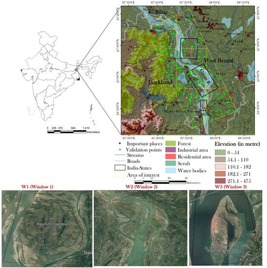 We selected a stretch of riparian landscape of the river Ganga from Rajmahal to Farakka barrage in India emphasizing three major dynamic river islands (locally, charland) dominated by patches. LULC classification in relatively stable areas is easier than highly dynamic landscape like charland and such work is undertaken by many scholars. How far the advanced methods are useful for delineating LULC units in such a dynamic area was given emphasis with different approaches of accuracy assessment. Successful application of one method in different similar sites proves its usability. Hence, to test the precision of the applied methods three such patches from the study stretch were used. The study area covers parts of Jharkhand and the West Bengal states of India. More precisely, it covers some parts of Sahibganj District of Jharkhand and Malda and the Murshidabad districts of West Bengal (Figure 1). The topography of the study area is dominated by alluvial plain, which is formed by the sediments deposited by Ganga, Mahananda and Kalindi rivers. The elevation of the region varies between approximately 12 meters to 90 meters. The regular flooding makes the region suitable for agriculture with seasonal water scarcity. The climate of the region is of sub-humid monsoon type (Koppen-Cwg) with average annual rainfall more than 1500 mm and temperature ranges from 10 and 38 °C. The rapidly increasing population causes large-scale landscape transformation by the expansion of agricultural land and human settlement along with well-defined riverbank erosion and flood hazards. Riverbank erosion has caused significant changes in the LULC pattern in the area for a long time. The frequent flooding and riverbank erosion have caused large-scale displacement of the human settlements in the region during the first decade of the 21st century [64].
