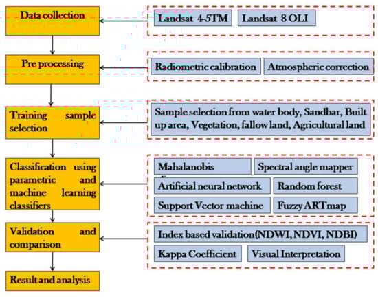 Several techniques have been developed to map LULC patterns and dynamics from the satellite observations, including traditional terrestrial mapping, as well as satellite-based mapping. Terrestrial mapping, known as a field survey, is a direct way of mapping in which the map can be produced at various scales incorporating information with different levels of precision, although it is a manpower-based, time- and money-consuming way to map large areas [28]. Moreover, there is a chance of subjectivity in mapping. On the other hand, the satellite- and aerial photograph-based mapping of LULC are cost-effective, spatially extensive, multi-temporal, and time-saving [29]. Earlier, the spatial resolution of satellite data was comparatively less than that of the maps prepared through terrestrial surveys. With the advancement of remote-sensing (RS) techniques and microwave sensors, satellites provide data at various spatial and temporal scales [30,31,32]. RS provides the opportunity for rapid acquisition of information on LULC at a much reduced price compared to the other methods like ground surveys [33,34]. The satellite images have the advantages of multi-temporal availability as well as large spatial coverage for the LULC mapping [35,36]. In the past few decades, studies on mapping, monitoring and forecasting of LULC dynamics have been carried out using medium- and low-resolution observations from satellites, such as Landsat, Satellite Pour l’Observation de la Terre, or Satellite for observation of Earth (SPOT), Indian Remote Sensing (IRS) Satellite Resourcesat, Advanced Spaceborne Thermal Emission and Reflection Radiometer (ASTER), Moderate Resolution Imaging Spectroradiomete (MODIS) and others [18,31,37,38,39,40]. With the advancement of hyperspectral satellite sensors, the importance of RS has increased many times in the research field and for planning purposes.