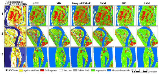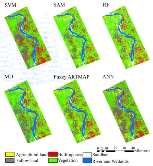 The spatial analysis of the LULC map shows that the built-up area, and rivers and wetland are more prominent and clearer in the outputs of SVM and random forest classifiers, while they are least prominent in the output of SAM. On the other hand, the fallow land and agricultural land are more prominent in the output of ANN, followed by fuzzy ARTMAP and Mahalanobis distance classifiers. The vegetation cover and sand bar are fairly classified in all classifiers. In RF and SVM, they are excellently classified (Figure 4). Overall, maximum coverage of built-up land was classified by the SVM and fuzzy ARTMAP methods, whereas least coverage of built-up land was classified by SAM and random forest. On the other hand, the highest coverage of vegetation is found by the SAM classifier, followed by RF and SVM classifiers, while the least coverage is found by ANN. The coverage of fallow land is completely reciprocal to the vegetation cover and the ANN classifier has the highest coverage, followed by fuzzy ARTMAP and MD classifiers, while SAM has the least coverage (Table 3). The coverage of rivers and wetland and sand bar are almost equally classified in all classifiers.