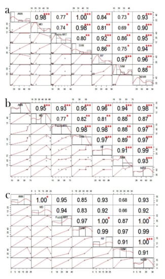 The correlation among the six LULC classifiers and satellite data-derived indices (NDWI, NDVI and NDBI) for (a) window 1, (b) window 2, and (c) window 3. (*, ** and *** are the significant levels at 0.001, 0.01, and 0.05, respectively).