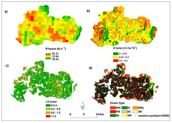 (a) Eight-year annual average rainfall erosivity map, (b) Soil erodibility factor map (c) slope length and steepness (LS) factor map, and (d) random points generated for the analysis overlaying the 2015 arable land use.