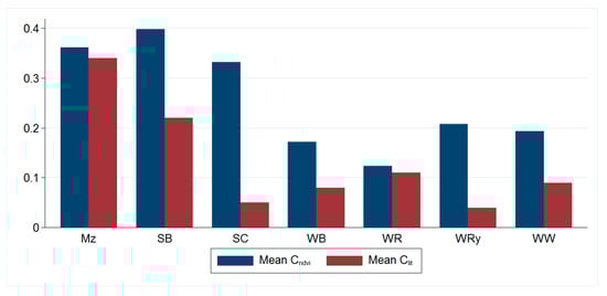 When it comes to annual C value computations, which is the required input factor for the USLE model, average Cndvi calculations resulted in higher values compared with empirical Clit values specifically for winter cereals and summer cereal (Figure 3). The highest discrepancies were observed on parcels covered with SC (85%) and WRy (80%) while the lowest discrepancy, around 5% and 5.3%, appeared to be on parcels covered with WR and Mz respectively. Bargiel et al. [57] also noted that C factor determination through remote sensing application gives better accuracy for summer crops than winter grains (without considering WR) in a similar condition in Poland. Annual C values of Mz and WR can be captured with a better accuracy as indicated by the least discrepancy estimated here. Comparatively, the NDVI-derived C value estimation also performed better for SB compared with winter and summer cereals. This could be explained to some extent to the variation in patterns of foliar orientation of these crops. WR, Mz and SB categorized as plagiophile and planophile, respectively, while most cereals categorized as erectophile crops behave differently with respect to canopy spectral reflectance [58]. Erecophile canopy, leaves arranged in vertical manner, could trap reflected radiation within the canopy and reduce the NDVI while the opposite is true for planophile canopy orientation types [29].