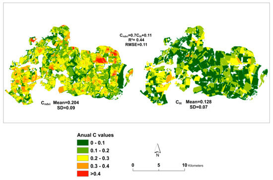 Table 4 indicates the spatial correlation between monthly CndviM and ClitM values of the entire landscape. Better correlation between CndviM and ClitM values was observed in images taken in the months between spring and mid-summer, with the highest correlation coefficient (r = 0.93) computed on the image taken on 09 May 2016. The lowest correlation, however, was observed in the months of late summer and autumn, while in a few of the images a negative relationship between CndviM and ClitM values was observed. In particular, August, September, and October were the months where the highest RMSE was computed. This can be due to variations in the vitality of many winter-sown crops during these periods of the year; NDVI-based C factor values, as opposed to the SLR based values, which mainly reflect the function of the protective ability of the crops in question, are highly influenced by the vitality of the plants rather than the crop-cover percentage [20,42]. In these periods, large areas of the landscape (see Figure 1b,c for proportion of crop cover) are expected to have either maturing and senescing crops (e.g., August) or early-emerging and less-ground covering crops (e.g., October), in which case the NDVI values were lower (Appendix A Figure A3), in turn resulting in elevated monthly CndviM values. One possible solution could be to incorporate yellow vegetation indices such as normalized difference tillage index (NDTI), and normalized difference senescent vegetation index (NDSVI), in the process of formulating the C factor equation, for future in order to improve the C value estimation across all seasons [7]. Overall, lower RMSEs were consistently computed on images taken during the month of June in each of the three years considered.