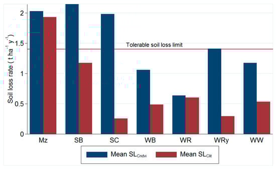 Spatially, the potential soil loss rates predicted using the two different C factor inputs revealed an RMSE as high as 1.17 t ha−1 y−1, which was below the maximum tolerable soil erosion limit (Figure 6). However, the spatial distribution of the potential soil erosion risk varied greatly. For example, the proportion of the landscape classified below the maximum tolerable soil loss limit in the case of SLcndvi was close to 85%, while the same classification in the case of SLclit accounted for close to 70%. In aggregate, the soil loss rate obtained by employing Cndvi as a C-factor input for the USLE model resulted in two times higher prediction than when using Clit.