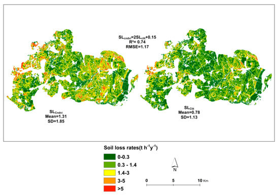 where SLClit is the potential soil loss predicted using Clit, SLCndvi is the soil loss predicted using Cndvi, and n is the number of pixels coinciding in the analysis. Furthermore, the erosion prediction accuracy of using the USLE model in general, or through the two different C values (SLcndvi and SLclit) in particular, was discussed by comparing the model output with long term (from 1982 to 1996) average soil erosion values measured from field experiments at the Holzendorf (Latitude 53.386818, Longitude 13.780225) research station [55]. The experimental set up and measured erosion values can be referred from Deumlich et al. [55].