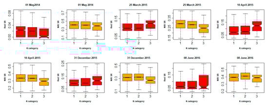Comparison of surface reflectance (SR) values across soil erodibility (K) categories in different images (scene dates chosen based on statistically significant impact on Cndvi according to Table 4). K categories: 1, ≤ 0.15; 2, = 0.15 to 0.3; 3, ≥ 0.3. The notches in the boxes indicate statistical significance in median reflectance of Red and Near Infrared (NIR) along the K categories at a 95% confidence interval.