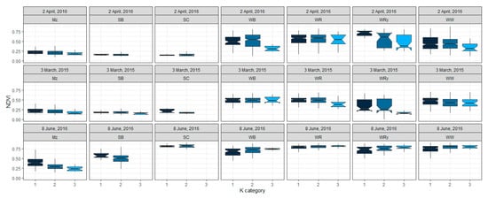 Impact of soil heterogeneity (categorized as 1, K ≤ 0.15; 2, K = 0.15 to 0.3; 3, K ≥ 0.3) on NDVI values across different crop cover types and seasons in the study area (notches indicate a significant variation in median NDVI along the K category at a 95% confidence interval).