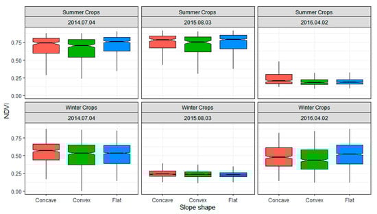 Box plots indicating influences of slope shapes on NDVI values across crop categories and seasons. Winter Crops are composed of WW, WB, WR, and Wry, while Summer Crops are Mz, SB, and SC. Notches indicate significant impact between slope shape categories on median NDVI values (the scene dates are chosen based on statistically significant impact on Cndvi estimates according to Table 5).