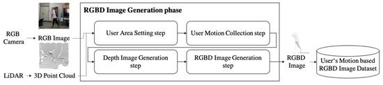 The process of extracting 3D landmarks for user motions using 3D point clouds and RGB images from a LiDAR and an RGB camera is shown in Figure 1. In RGBD Image Generation phase, an RGBD image, including the user’s image and the user’s boundary, is generated. To generate the RGBD image, a depth image is generated representing the user’s boundary; this is based on a 3D point cloud collected with the LiDAR and utilizes the user’s RGB image collected with the RGB camera. When generating the depth image by up-sampling the 3D point cloud, some disparities are rectified; however, there is a limit in the improvements with the LiDAR measurement method. The depth image is generated using an RGB image to correct the disparities of the 3D point cloud.