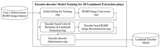 In the Encoder–Decoder Model Training for 3D Landmark Extraction phase, an improved encoder–decoder model is trained using the generated RGBD images. In the previous encoder–decoder model [14], 2D landmarks were extracted using RGB images; here, the model is improved to extract 3D landmarks by inputting RGBD images.