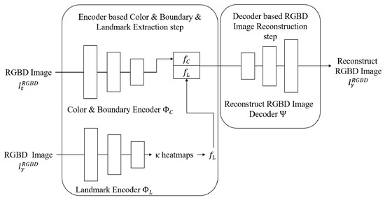 In the encoder–decoder optimization step, the Color and Boundary Encoder, Landmark Encoder, and Reconstruct RGBD Image Decoder are optimized by comparing the reconstructed RGBD image with the original RGBD image. The encoder–decoder is trained to minimize the difference between the two RGBD images . If the learning rate is greater than the set learning rate or the training progress is completed, the Color and Boundary Encoder model, Landmark Encoder model, and Reconstruct RGBD Image Decoder model are stored. If not, the process loops back to the Color and Boundary and Landmark Extraction processes.