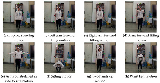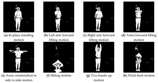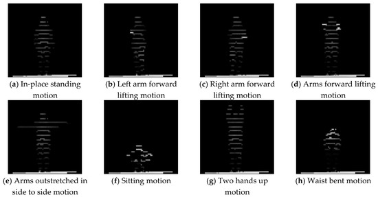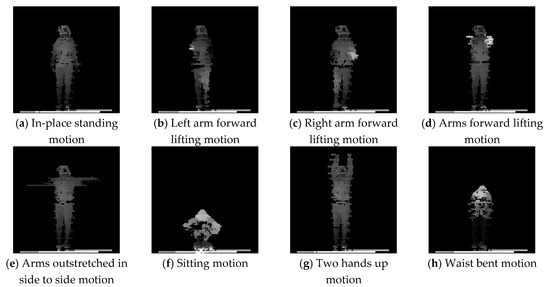 Figure 8 shows the depth images projected on the x-y plane based on the value accumulated in a voxel in a 3D point cloud in the user’s space. The depth image was white when the body was close to the LiDAR, and black when the body was far. The 3D point clouds could estimate the boundary of the user’s motions. In most users’ motions, about 13 laser sensors of LiDAR measured the user’s motion as shown in Figure 8a–e. In Figure 8e, only one laser sensor of LiDAR was used. When the user’s body has the smallest motion as shown in Figure 8f, about 5 laser sensors of LiDAR were used. When the user’s body has the largest motion as shown in Figure 8g, about 16 laser sensors of LiDAR were used. As shown in Figure 8h, 10 laser sensors of LiDAR were used to collect 3D point cloud. The number of laser sensors of LiDAR used depends on the user’s motions.