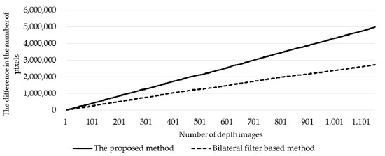 The numbers of additional pixels characterized in the proposed method and the bilateral filtering method are compared in Figure 12. The 3D point cloud-based depth image provided an average of 3342.6771 pixels, and the proposed depth image provided an average of 7687.2071 pixels. In the depth image generated with bilateral filtering, an average of 5713.6205 pixels were provided. The depth images from the proposed method provided 4,991,865 more pixels than were present in the 3D point cloud-based depth images, and bilateral filtering provided 2,724,214 more pixels than were present in the 3D point cloud-based depth images. In the proposed method, there were many pixels with a depth value, which implies that the detailed user’s body was expressed.