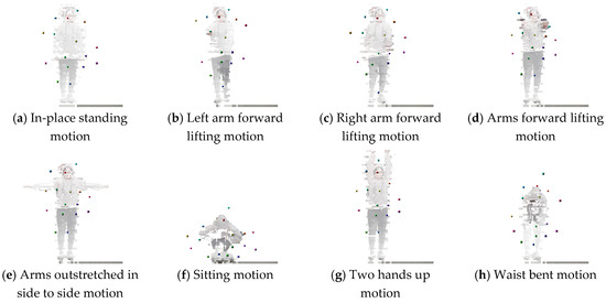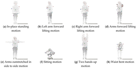 The extraction result of 3D landmarks of a user’s motion was analyzed according to the number of κ’s. As the number of κ increased, 3D landmarks were added around the user’s upper and lower body. 3D landmarks were set in the non-user’s body as a certain number was exceeded. When κ was 6, 3D landmarks were set up on one right leg, two on the left leg, one near each arm, and one in the center of the upper body as shown in Figure 13. When κ was 8, one 3D landmark is set next to the left arm instead of the user’s body as shown in Figure A1. Upper body-oriented 3D landmarks were set when κ was 6. When κ was 10, 12, 14, and 16, 3D landmarks were set evenly between the upper body and the lower body as shown in Figure 15, Figure A2, Figure A3 and Figure 13. The 3D landmarks set in the non-body part were set to 2 when κ was 10, 3 when κ was 12, and 5 when κ was 14 and 16 as listed in Table 2. 3D landmarks could not be set properly when the size of the body changes, such as when the body is folded when a user sits.