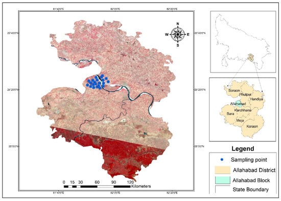 Study site and in situ measurement points (main frame: satellite image with sampling points, upper inset: Uttar Pradesh State showing Allahabad and lower inset shows Allahabad district with its blocks).