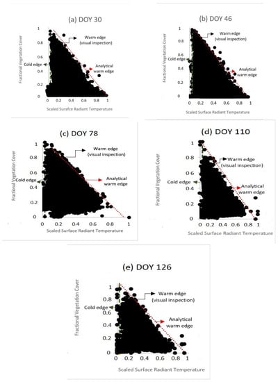 These figures (Figure 2) agree with the interpretation of T*/Fr space by various authors [6,27,28,29,30,31,32] showing the salient features of the triangle: the warm and cold edges and the triangular relationship between soil water content and fractional vegetation cover.