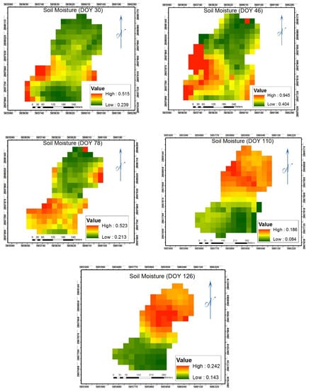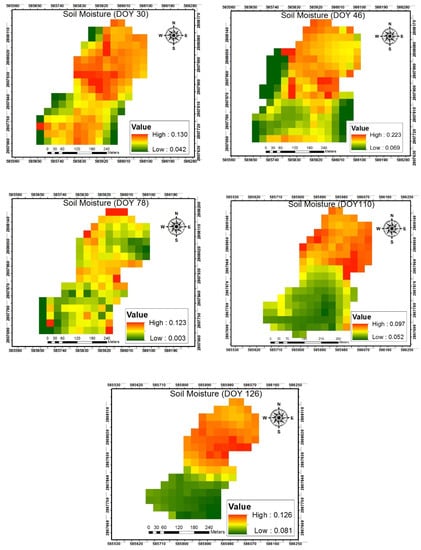 Correspondingly, the simulated soil surface moisture using the geometric model algorithm was also mapped (Figure 4). The distribution also varies in both time and space. The range of soil moisture availability also decreases gradually from DOY 46 to DOY 110 due to the aforementioned dryness. This showed that the results from the two algorithms are consistent.