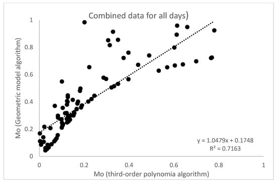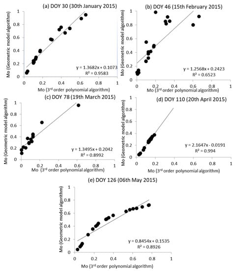 The estimated soil surface moisture obtained from the third-order polynomial algorithm and simplified geometric model algorithm were correlated. Figure 5 depicts the Mo values obtained from the two algorithms which correspond to data points where in situ measurements were done. It is apparent from Figure 5 that strong positive correlation was found to exist between the simulated soil surface moisture using the two algorithms. On all the dates, R2 is greater than 0.6 and mostly greater than 0.8. Moreover, the data sets for all days were combined in order to reinvigorate this finding (Figure 6). It was found that the agreement between the two algorithms was promising (R2 0.7). This result adds to the validation of the use of the recently introduced simplified geometric method by [26].