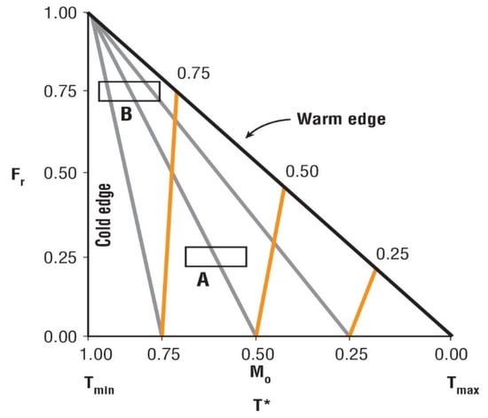 where and are the intercept and slope of the linear warm edge respectively. In practice, however, fitting a line to the warm edge requires a combination of analytical and trial and error approaches (using one’s eye or intelligent manual fit). It should be noted, however, that for a right triangle, such as shown in Figure 2, a warm edge that extends from the vertices T* = 1.0, Fr = 0 to T* = 0, Fr = 1 will have the form T* = 1 − Fr along the warm edge.