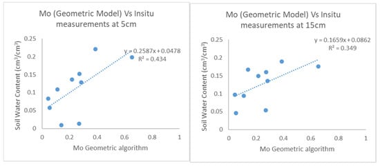 Correlation between soil water content and Mo produced from the geometric model algorithm for a threshold of 0.3 (pixels with values of Fr greater than 0.3 were discarded); the left side corresponds to the 0–5 cm depth SWC measurements and the right side is for the 0–15 cm depth measurements.