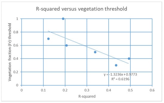 Vegetation fraction (Fr) threshold versus the correlation between remotely derived Mo from the simplified triangle method and that measured at the surface in the 0–5 cm layer.