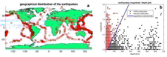 The seismic events were selected from the United States Geological Survey (USGS) catalogue. From the catalogue, all recorded events from 25 November 2013 to 12 April 2019 with a magnitude equal to or greater than 5.5 were downloaded and represented with a black star or dot in Figure 1 according to their geographical distribution (Figure 1a) and the magnitude/depth distribution (Figure 1b). Although some authors also included deep earthquakes in ionospheric disturbance investigations [15,16], we prefer to exclude them, as we consider the possibility that deep earthquakes could affect the ionosphere to be lower. To achieve this selection, all Mw5.5+ events up to 20 km depth were selected and for more in-depth events, a selection based on a higher magnitude and depth was applied. In particular, a linear interpolation was applied from Mw5.5 at 20 km and Mw7.0 at 150 km depth. This choice is a compromise to exclude the deeper earthquakes but not the strongest and deepest events that could produce a disturbance in the ionosphere because of their significant released energy. The number of the selected events was 1830 out of 2437 downloaded earthquakes, represented by a red star/dot in Figure 1. In particular, in Figure 1b it is possible to note the exclusion of the deepest events. The selected earthquakes are a sub-set in which it is more reliable to search for effects induced in the ionosphere, but future works can also investigate other events or subsets.