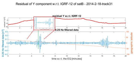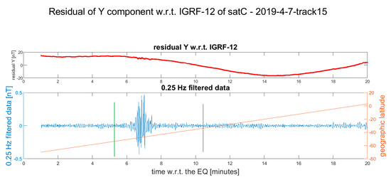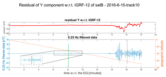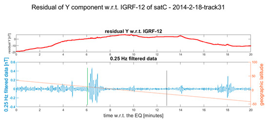 All the satellite data of the selected track are stored in a text file for further analysis. The produced material is visually investigated and the tracks that present some possible features linkable to the seismic events are then re-analyzed and plotted again. For this final analysis (presented in Figures 3–14), only the Y component is considered: after the subtraction of IGRF-12 model, a high pass filter at 0.25 Hz was applied and both quantities were then plotted. The frequency cut-off was chosen after multiple tests as the best value to extract the anomalous signal possibly related to the seismic event. Taking into account that the sampling rate of the data was 1 Hz, the available band was 0.25 Hz–0.50 Hz (following Nyquist theorem).
