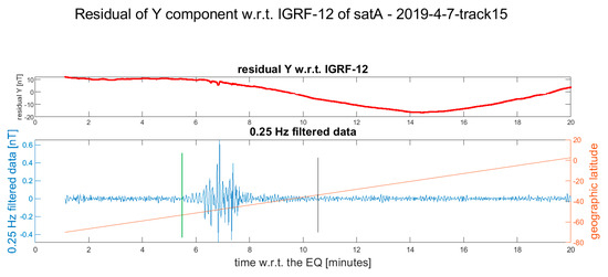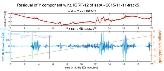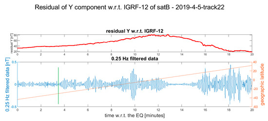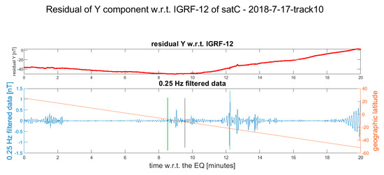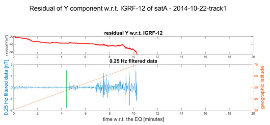 The Swarm magnetic data during the earthquake occurrence are represented following the same order of Table 1, i.e., a chronological one, from Figure 3, Figure 4, Figure 5, Figure 6, Figure 7, Figure 8, Figure 9, Figure 10, Figure 11, Figure 12 and Figure 13. Each figure is horizontally aligned with the origin time of the earthquake. In the upper part is shown in red the residual of the Y component of the magnetic field with respect to the IGRF-12 model. The Y component was selected as it is the most sensible for the internal perturbations ([22,31]). In the lower graph, a 0.25 Hz high-pass filter was applied, and the filtered data are shown in blue. Here, we did not subtract any polynomial, as the filter was sufficient to remove the residual trend. A black vertical line underlines the position where the satellite crosses the earthquake latitude if it is after the earthquake occurrence. An orange line represents the latitude of the satellite. Note that only the data inside −70° and +70° geographical latitude are shown. More details are provided in the Supplementary Materials, where Figures S1–S10 show the residuals of the other components as well as the total intensity of the magnetic field, as deduced using method 1 and method 2. Figure S11 also shows an example of a track without any evidence of possible co-seismic magnetic disturbance. The reasons for the lack of disturbance in the latter case could be several: the earthquake happened in the Atlantic ocean ridge and the ocean water depth at the epicentre is of several kilometres (about 3.4 km), thus possibly attenuating the mechanical effect (also considering the low magnitude of the event: Mw 5.5); another reason could be an intrinsic disturbance in the magnetic signal all over the track that could cover the detection of any small co-seismic effect. On the other hand, in the Figures S1–S10, the magnetic disturbance cannot be explainable merely by geomagnetic activity, which was low at the acquisition time; nevertheless, it could be induced by some other geophysical source (such as electric and magnetic fields produced by ocean currents—Grayver et al., 2016—or tectonic stress along the ocean drift).