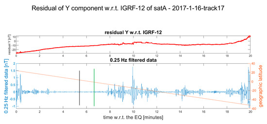 Residual of the Y component of Swarm Alpha magnetic field after the occurrence of the Mw 5.6 2017-01-16 earthquake. The vertical green line in the lower plot is the candidate point where the earthquake-induced phenomena are supposed to start. We excluded the anomalies at the beginning of the track, which are too close to the earthquake (this could be due to the equatorial electrojet or other equatorial electromagnetic phenomena). The selected point is the start of the wider anomalies in the track. We noticed that its duration is longer than other selected anomalies. The vertical black line represents the point where the satellite crosses the earthquake latitude. The Supplementary Materials show more details and the other available Swarm magnetic data are represented (Figure S7).