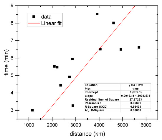 The 12 selected tracks associated to 10 seismic events have been analyzed to search for a possible linear regression between the time interval of the arrival of a supposed co-seismic gravity wave in the ionosphere and the distance between the epicentre and the Swarm satellite, as represented in Figure 14. The intercept has been fixed to the origin of the axis as the time to cover a null distance needs to be zero. The obtained slope is (0.00163 ± 0.00014) min/km that corresponds to a propagation velocity of (10.04 ± 0.85) km/s. The R2 = 0.92 denotes a good agreement with this linear regression, confirming that the two quantities plotted in the graph seem to be linearly correlated. Although this correlation is pretty good, the propagation speed for this phenomenon seems to be higher than we might expect for this kind of waves. We propose that actually this could be caused by two different involved phenomena: one from the Earth’s surface that reaches the maximum electron density altitude (hmF2 or altitude of ionospheric layer F2), and another physical phenomenon that propagates from this altitude to the satellite position.