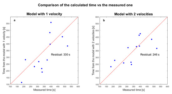 Comparison of the calculated time versus the measured one to propagate from epicenter to the satellite. The red line represents the ideal case, i.e., when the model is identical to the measurements. (a) A model with one velocity. (b) A model with two velocities. Each graph reports the corresponding sum of the residuals of the model with respect to the measured data. The two-velocity model shows the lowest residual.