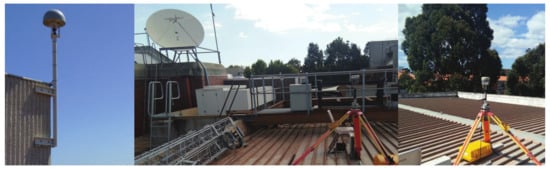 The data analysis is performed using GPS dual-frequency data with 1 Hz sampling rate collected on L1C and L2W channels. To simulate different measurement scenarios, the continuously operating reference station (CORS) UWA0 located at the University of Western Australia is used as the reference station, and the station CUT0 located on the roof of a building in the Curtin University (left panel of Figure 1), which is about 8 km away from UWA0, is used as the rover station to simulate the open-sky scenario. With similar baseline length, another rover receiver mounted on the roof of a lower building, which is surrounded by trees and metal structures (middle and right panels of Figure 1), is used to simulate the suburban scenario. The station is denoted as SUB0. The receiver and antenna types of both baselines are given in Table 1. The data collected from 6:34:45 to 23:59:59 in GPS time (GPST) on 15 October 2019 were analysed for both baselines. The data were collected under quiet ionosphere conditions. Based on the Australian total electron content (TEC) maps provided by the Australian Bureau of Meteorology/Space Weather Branch (IPS) [], during the test time periods, the test region had TEC values lower than 20 TEC unit (TECU). For the troposphere, the daily rainfall amount is 0 mm []. In this study, the lower bound of the C/ in the contribution is set to 12 dBHz, which is recognised as the minimal possible signal strength []. The satellite having the maximum mean elevation angles for the baseline is used as the reference satellite. It remains the reference satellite until its mean elevation angle is reduced to below 30 degrees. The elevation mask is set to 10 degrees in this study. It is noted that the reference station of RTK processing is assumed to be located under good measurement environment and broadcasts its data in a continuous manner.