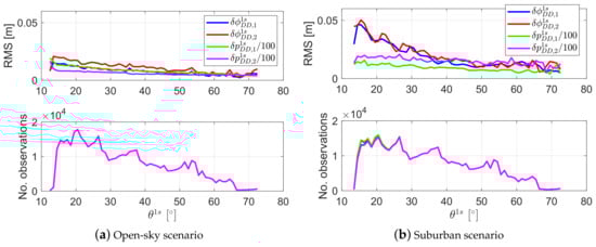 Root Mean Squares (RMS) of the double-difference (DD) residuals with respect to the elevation angles () in: (a) the open-sky scenario and (b) the suburban scenario. Note that the RMS of the code residuals is divided by a factor of 100. In the bottom panels, the blue, the red and the green lines are almost overwritten by the magenta lines.