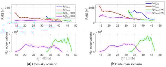 The RMS of the DD residuals is computed within small C/ intervals () of 0.3 dBHz starting from the minimum above the lower bound of 12 dBHz, and is shown in the top panels of Figure 3. In general, a higher correlation between the RMS and the C/ can be observed in the suburban scenario. It can also be observed that the signals on L2W (the red and magenta lines in the top panels) generally experience lower C/ than those on L1C (the blue and green lines in the top panels). This agrees with the results shown, e.g., in [] that the C/ for the L2 P(Y) signals are lower than those for the L1 C/A and L5 signals, which is related to the lower minimum received power of L2.