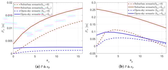 Figure 4 shows the variation in the improvement in range with the coefficients for the phase processing and for the code processing. The dashed lines represent the case using only the elevation-dependent weighting functions, i.e., setting and to zero, and the solid lines represent the case when setting and to the C/ coefficients leading to the largest for the corresponding and , respectively. The differences between the solid and the dashed lines for the same scenario, i.e., the same colour, denote thus the further contribution of the C/ to the elevation-dependent weighting models. It can be observed that for both the phase and the code processing, incorporating the C/ in the weighting model could generally lead to larger contributions in in the suburban scenario (see the red lines) than in the open-sky scenario. From Figure 4, the highest value of the elevation-related weighting coefficient is observed for the phase processing in the suburban scenario. This is consistent with the information shown in Figure 2 (the blue and red lines in the top panel of Figure 2b).