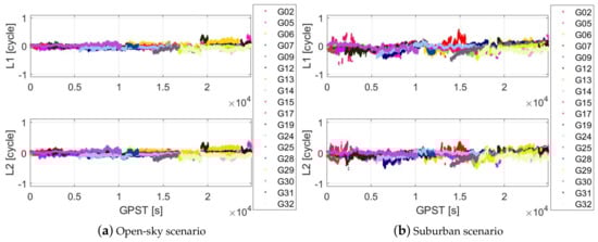 To demonstrate the effectiveness of the proposed ambiguity resolution method, Figure 5 shows the L1 and L2 residuals for all observed satellites above the elevation mask introducing the resolved ambiguities based on the model presented in this section and the ground truth of the baselines computed from the known positions of the points under both the open-sky and the suburban scenarios. The time period 0:00:00–6:56:01 (GPST) on 17 October 2019 was used for the computations. As shown in Figure 5a, the residuals in the open-sky scenario are generally within ±0.2 cycles, while those in the suburban scenario are larger due to the increased impact of multipath. Benefiting from the sequential exclusion algorithm and the fix-and-hold strategy applied for ambiguity resolution, the time epochs achieving successful FAR has increased from about 80% to 95% in the suburban scenario compared to the case without using the sequential exclusion algorithm. For the time epochs with partial ambiguity resolution (PAR), the average fix-rate, i.e., the averaged number of the fixed ambiguities among all the possible ambiguities, has also increased from about 55% to 91% upon applying the sequential exclusion algorithm. In the open-sky scenario, the FAR was achieved in almost all epochs, i.e., above 99.8%, whether or not the sequential exclusion algorithm is used. Note that the PAR aims to resolve a part of the ambiguities in case that the FAR cannot be achieved. Different from the PAR based on a pre-defined formal ambiguity success rate (ASR) [,], the PAR in this study refers to the resolution of a subset of the remaining float ambiguities, which allows the ratio test to be passed. The selection of the subset was determined based on the sequential exclusion algorithm discussed before and given in Appendices Appendix A and Appendix B for the baseline-known and -unknown cases, respectively. The algorithm is developed to deal with the miss-modelled effects that are difficult to be covered by the model and the formal ASR.