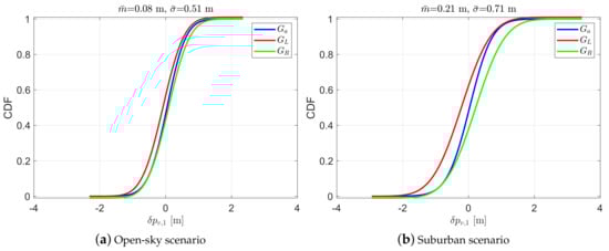 As examples, Figure 6 shows the empirical CDF and its overbounding CDFs and for the weighted code residuals on L1 in the open-sky (a) and the suburban (b) scenarios. To satisfy Equations (35) and (), for code residuals, the overbounding mean and standard deviations are searched from 0.05 m to 1 m with a step of 0.01 m, and for phase residuals from 0.001 m to 0.03 m with a step of 0.001 m. The excess mass is set to 0.01 in this contribution and will be considered by computing the protection levels in Section 4.3. The search begins from the smallest overbounding mean value, and for each mean value, the algorithm searches again from the smallest overbounding standard deviation. The search stops when Equations (35) and () are fulfilled.
