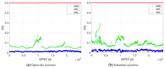 Figure 7 shows the positioning errors in the horizontal plane and in the vertical direction for both the open-sky and the suburban scenarios. A larger error scatter can be observed for the suburban scenario. The ambiguity-fixed HPEs, computed as the square root of the squared sum of the ambiguity-fixed north and east component positioning errors, and the corresponding HPLs (Equation (56)) are shown in Figure 8 for T1 with higher PDOP as an example for the worse case among the two tested time periods. The ambiguity-fixed HPEs, computed as the square root of the squared sum of the north and east positioning errors, and the corresponding HPLs are shown as blue and green dots, respectively. A HAL of 0.5 m (red dots) is assumed for both scenarios. The statistics of the HPEs and the HPLs are given in Table 5 for both T1 and T2. As shown in the Table 5 and Figure 8, the FAR is achieved in the open-sky scenario for almost all time epochs for both time periods. In the suburban scenario, the FAR is achieved in about 95% of the time for T1 and almost 100% for T2. For time epochs having PAR, the majority of the ambiguities are also resolved with an average proportion of above 90% among all the ambiguities. The RMS of the HPEs are at the cm-level in both scenarios with the ambiguities fixed. Although the HPLs in the suburban scenario are higher than those in the open-sky scenario, they are generally at the sub-dm to dm-level. The ambiguity-fixed HPLs always bound the corresponding HPEs, and are always bounded by the HAL of 0.5 m. This leads to an availability of 100% for both measurement scenarios for T1 and T2.