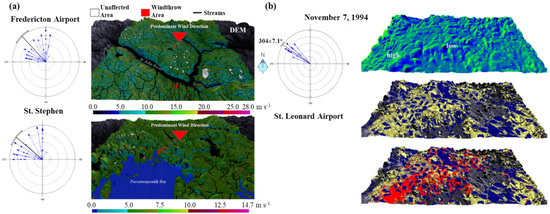 Wind plays an important role in defining the functional and structural characteristics of forest ecosystems globally [1,2,3]. Powerful windstorms are particularly notorious for causing widespread ecological and economic losses in wind-impacted landscapes [2]. Wind damage can cause significant challenges for forest managers. These challenges can range from potential fibre shortages in semi-mature forests due to their potential future yield, loss of habitat for some plant and animal species and loss in landscape aesthetics [4]. Salvage operations must contend with increased costs and danger to forest operators [4,5]. An example of such a wind event in New Brunswick (NB), Canada, was the three-hour, early morning Christmas Mountains blowdown of November 7, 1994, where 3.6 × 106 m3 of timber was lost to windthrow, valued at roughly $100 million in 1994 CAD [5]. On a landscape hierarchy, the degree of windthrow for a specific location arises from localised interactions with prevailing synoptic and small-scale airflow patterns (sustained and turbulent), variation in topography, storm duration and intensity, vegetation cover and on-the-ground management practices [6,7]. Because of the danger windthrow presents, it is important to identify and manage forest areas that are at significant risk of being damaged by strong winds [8].