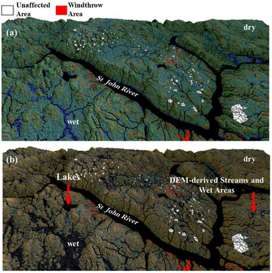 Map of height above nearest drainage point, HNDP (a) [18,19] and LanDSET-modelled relative soil water content (b) for a small area in the vicinity of the Greater Fredericton Area, NB. Blue to cyan- (a) and black-coloured areas (b) in the maps coincide with wet areas (i.e., exposed surface water and wetlands); white and red polygons in the maps coincide with forest areas unaffected and affected by windthrow, respectively.