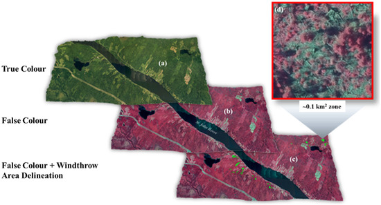 In the false-colour image in Figure 4d (NIR+RG), light pink to greenish colours correspond to damaged and windblown trees and ground debris (e.g., fallen stems, dead detached foliage and branches and exposed forest floor), whereas bright red colours coincide with healthy, undamaged trees and foliage. Colour rendering of images to false colour, as demonstrated in Figure 4b,c, helps to locate windthrow-affected areas.