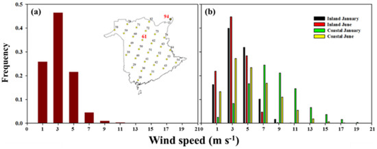 Figure 5 gives province-wide windspeed frequencies as a function of RCM-modelled historical climatic regime (1950–2005; inset to Figure 5a) and seasonal wind for two locations in NB (Figure 5b), i.e., one inland location on the southern boundary of study area 2 (gridpoint 61, near the Christmas Mountains) and one coastal location, near Miscou Island, NB (gridpoint 94; see inset to Figure 5a). There was significant deviation (climatology) in overall wind speeds between the two locations. The sustained maximum wind speeds in coastal areas had a greater chance of exceeding 9 m s−1, attaining wind gusts > 13 m s−1, particularly during winter, due to stronger atmospheric circulation.