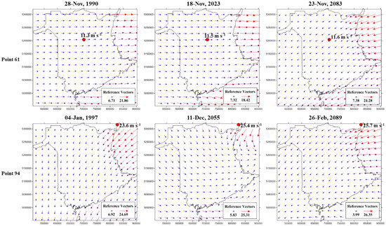 RCM-generated wind speed and direction for six extreme wind events corresponding to the historical period (1950–2005) and two future climate scenarios, RCP’s 4.5 and 8.5, over the 2006–2100 period. The extreme events were based on searching modelled daily wind data for highest maximum wind speed for gridpoint locations 61 and 94 (Figure 5a). Time of occurrence of projected events is indicated for individual wind distributions.