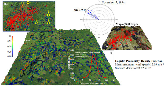 Predicted (a) and observed (b) areas of windthrow overlain a Landsat image of the Christmas Mountains (study area 2; Figure 1) and soil-depth classes (i.e., SDEPTH; c). The yellow dots and circles in subfigure (b) indicate some sample locations where windthrow had a high probability of occurring (based on model projections) but were not identified as containing windthrow during initial photointerpretation. The colours and colour bar in subfigure (a) indicate the strength of sustained maximum winds during the Christmas Mountains blowdown relative to wind speeds estimated for extratropical cyclone Arthur (d); a value of 1.0 (red) indicates winds in excess of 20 m s−1 (PWG > 26 m s−1) and a value of 0.25 (blue), sustained maximum winds of ~10 m s−1 and PWG of ~14 m s−1. Soil-depth classes in the Christmas Mountains (c) vary from SDEPTH class 2 to 4, with SDEPTH of class 2 representing the shallower soils (i.e., soils 30–65-cm deep).