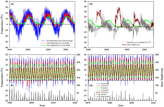 Actual air and soil temperatures (°C) within a high bF-content stand (~95% bF) in westcentral New Brunswick near Nashwaak Lake (46.47222°N latitude and 67.57222°W longitude), near study area 2 (inset, Figure 1), and associated soil thermal fluxes (W m−2), and snow depths (cm; a,b) for 2003 through to 2006. Subfigures (c,d) give modelled soil temperatures at various soil depths for RCM gridpoint 61 (inset, Figure 5a) for current (1990–2020) and future RCM-based calculations of climatic conditions (2070–2100) for a hypothetical bF forest with an effective leaf area index of 8.4. Simulations with the ForHyM-model [45] were conducted with a soil complex involving a forest floor (7-cm thick), A- (11-cm), B- (50-cm), C1- (50-cm), C2- horizon (50-cm) and 11 subsoil layers, each 100-cm thick. Soil temperature at each depth was calculated at the centre of each layer.