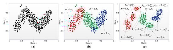 () A scatterplot of HSI samples over two spectral bands. () Illustration of the MFA model with each ellipse representing a Gaussian component. MFA has three components colored red (), green () and blue (). Their mixing proportions are given by . () Illustration of DMFA model with each ellipse representing a Gaussian component. The number of components and mixing proportions of the first layer of DMFA are the same as MFA. For the red component, we further learn a second layer of DMFA with three components. For the green and blue components, both of them are learned a second layer of DMFA with two components, respectively. We also introduce the second layer component indicator variable and mixing proportions , where is the total number of the second layer components associated with the first layer component m. is specific to the first layer component and need not be the same for all m. In this example, , and .