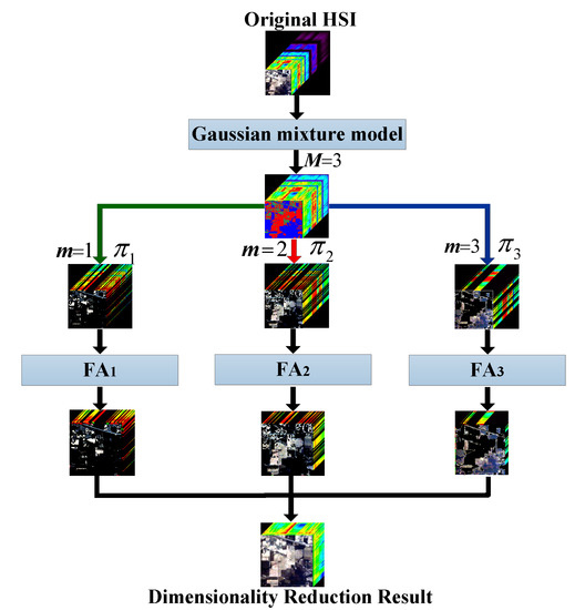 where means that is Gaussian vector with zero mean and identity matrix as the covariance matrix. The parameters of the m-th factor analyzer include a mixing proportion , mean , a factor loading matrix , and a diagonal matrix which represents the independent noise variances for each band.