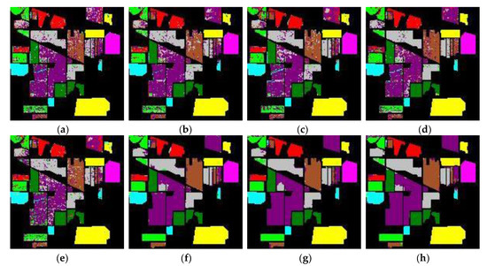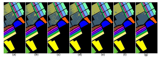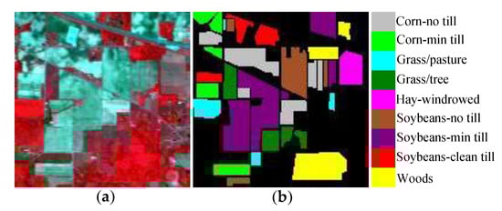 The Indian Pines dataset was collected by the Airborne Visible/Infrared Imaging Spectrometer (AVIRIS) sensor at Indian Pines. The image contains pixels with a spatial resolution of 20 m and 220 spectral bands from 400 nm to 2500 nm. In the experiments, noisy bands and atmospheric vapor absorption bands are excluded leaving 200 spectral bands. Figure 5 shows the false-color composite of the Indian Pines image and the corresponding ground reference map, respectively. The nine largest classes are considered for classification [24,56]. For the Indian Pines, the University of Pavia, and the Salinas datasets, 10% of the labeled samples for each class are randomly selected as training samples, and the remaining 90% are used as the test set, respectively. Table 1, Table 2 and Table 3 provide information on the number of training and test samples for each class of interest, respectively.
